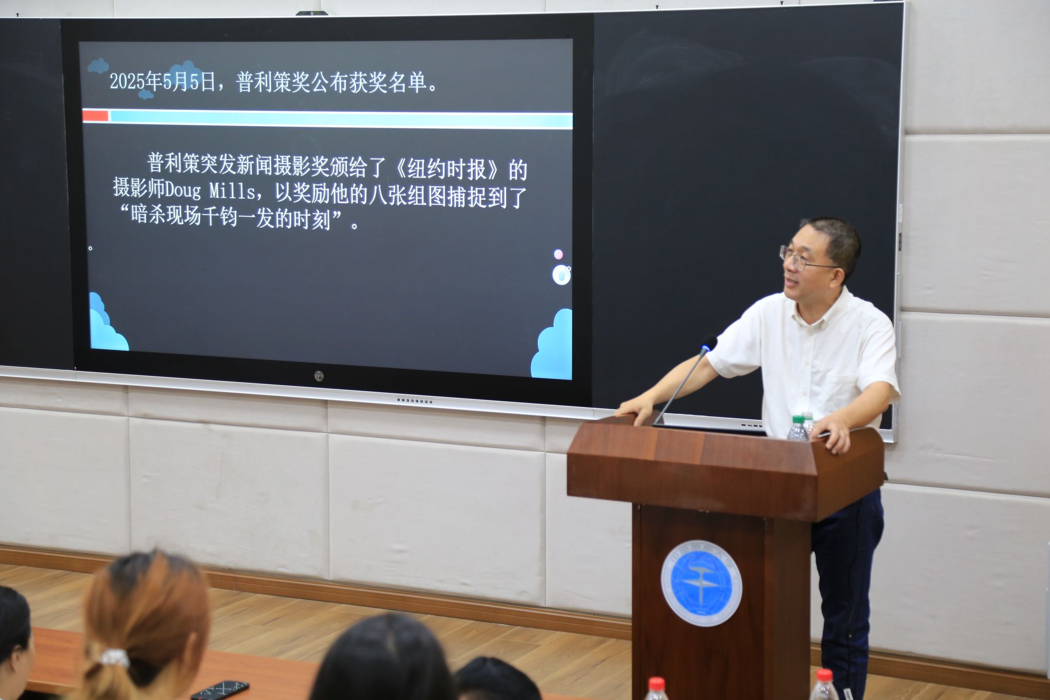刘震副教授强调,在AI时代,图片仍然是讲述故事的重要手段,具有不可替代的价值。他以去年全球关注的“特朗普遇刺事件”系列新闻照片为切入点,详细解析了摄影作为叙事媒介的独特价值,并特别展示了美联社记者埃文·武奇拍摄的“子弹穿透瞬间”组图,指出这组照片通过精确的瞬间捕捉、多角度构图和精准的景深控制,不仅记录了历史事件,更构建了完整的视觉叙事体系。他说:“当文字记者还在组织语言时,这些照片已经向全世界讲述了完整的故事。”