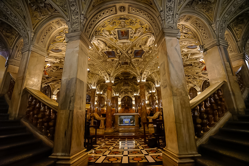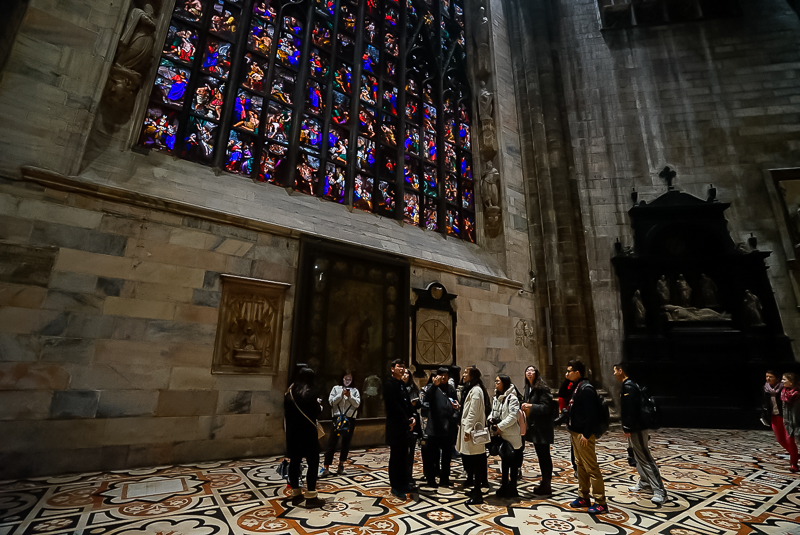 进入教堂之后,马林老师以米兰大教堂作为范本,对哥特式建筑做了简单讲解。他认为:“哥特式建筑具有:高、棱、空的特点,而其所用窗型多为长条形,从内向外看时,由于可以透光,窗子呈现出彩色;而从外向内看时,则不透光,窗子因而呈黑色。哥特式建筑多出现于法国和德国,尖顶式的设计最早是为了防止积雪,而教堂里十字架式的平面则是为了体现教堂的庄严”。讲解完毕,马林老师又带领访学团参观了米兰大教堂内最重要的圣坛及神坛,并对米兰大教堂的雏形——教堂底层的拜占庭式小教堂进行观赏。