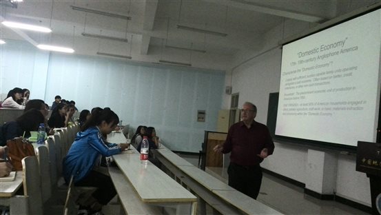 David Lux教授专攻科技史,史学造诣颇深。本次讲座上,David Lux教授从经济发展与社会变化的角度,为听众讲述了美国发展史。从17到18世纪一夫一妻的家庭经济,到19世纪20世纪,随着工厂的发展、美国内战、妇女运动等等因素对家庭经济产生影响,美国的家庭经济逐渐过渡到今天的消费社会,David Lux教授简明扼要地概括了美国家庭经济、工业社会、消费社会的特征,剖析了美国社会变革的内在动力。