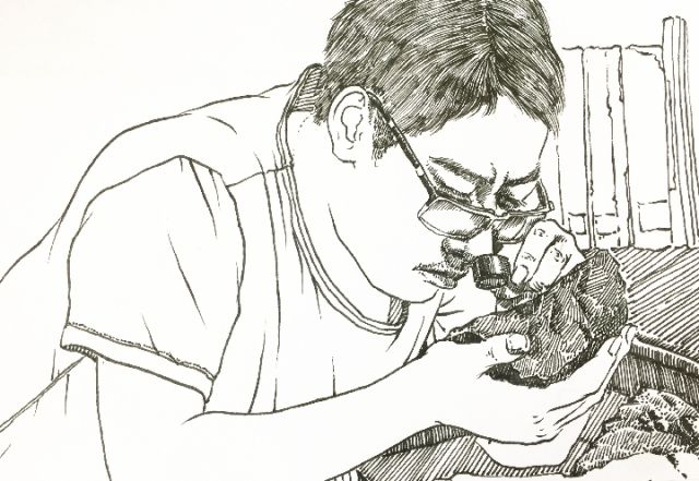 张世春听到了心里。随后,他开始了在校园的写生,并且向其他专业老师同学请教野外地质调查实践教学的有关情况。在收集一手资料之后,在2个月的时间里,他创作了《“小锤君”的故事》系列钢笔画。张世春说,“‘小锤君’是地质人的一个比喻,大家一看就知道与地质有关,这也和学校办学特色较为契合。”