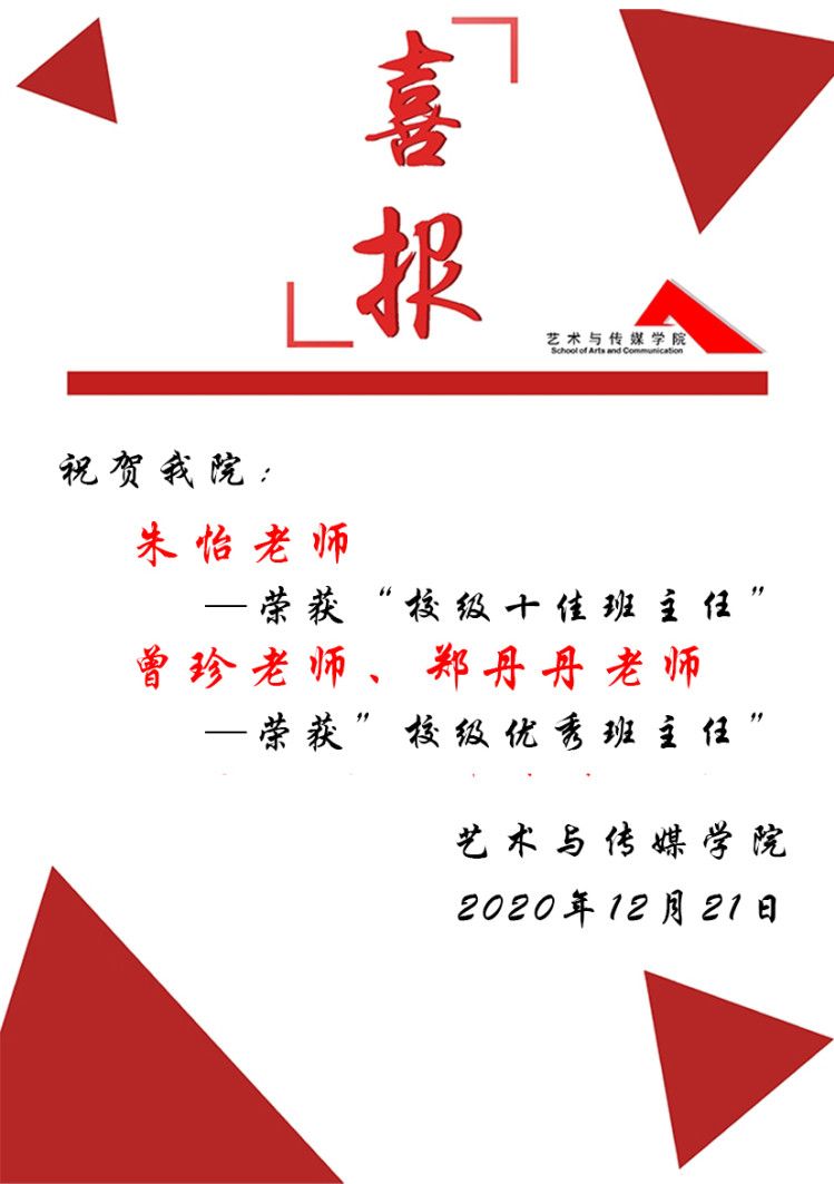 在我校开展的“2020年全校‘十佳班主任’和‘优秀班主任’评选活动”中,经个人申报、学院推荐、学校优秀班主任工作小组审核和网上公示,共评选出10名老师获得校级“十佳班主任”称号、30名老师获得校级“优秀班主任”称号。其中,蜜桃网 有3名老师在此次评选活动中脱颖而出:朱怡老师荣获校级“十佳班主任”称号、曾珍、郑丹丹老师荣获校级“优秀班主任”称号!
