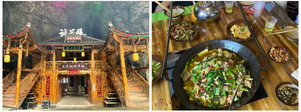 两位老师先带领同学们前往腾龙洞景区,品尝了当地特色的土家地坑吊锅,在山洞吊锅餐厅中感受了土家淳厚的民风和当地的美味特色,同学们便重新打起了精神,迎接此次利川之行的第一站——腾龙洞风景名胜区。