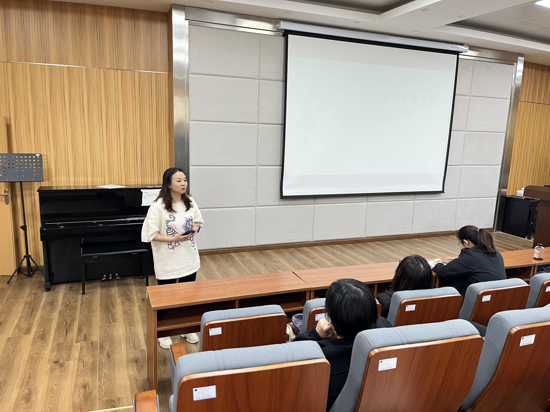 讲座由音乐系主任周莉副教授主持。首先,学院副院长袁玥副教授介绍了朱梅梵教授情况。朱梅梵,武汉理工大学本科生院素质教育中心,教授,博导,教育部学位中心评审专家、全国大学生文化素质教育学会理事、湖北省高校艺术教育研究会秘书长、全国美育研究会理事。出版多部文化艺术类专著、教材及音乐专辑;在《光明日报》理论版、《中国高等教育》、《中国高教研究》等重要期刊上发表论文30余篇;在中国MOOC平台录制上线《中国民族音乐》获国家精品课程;2011年和2016年在武汉音乐学院编钟音乐厅成功举办由省教育厅、省文化厅组织的两场个人独唱音乐会。