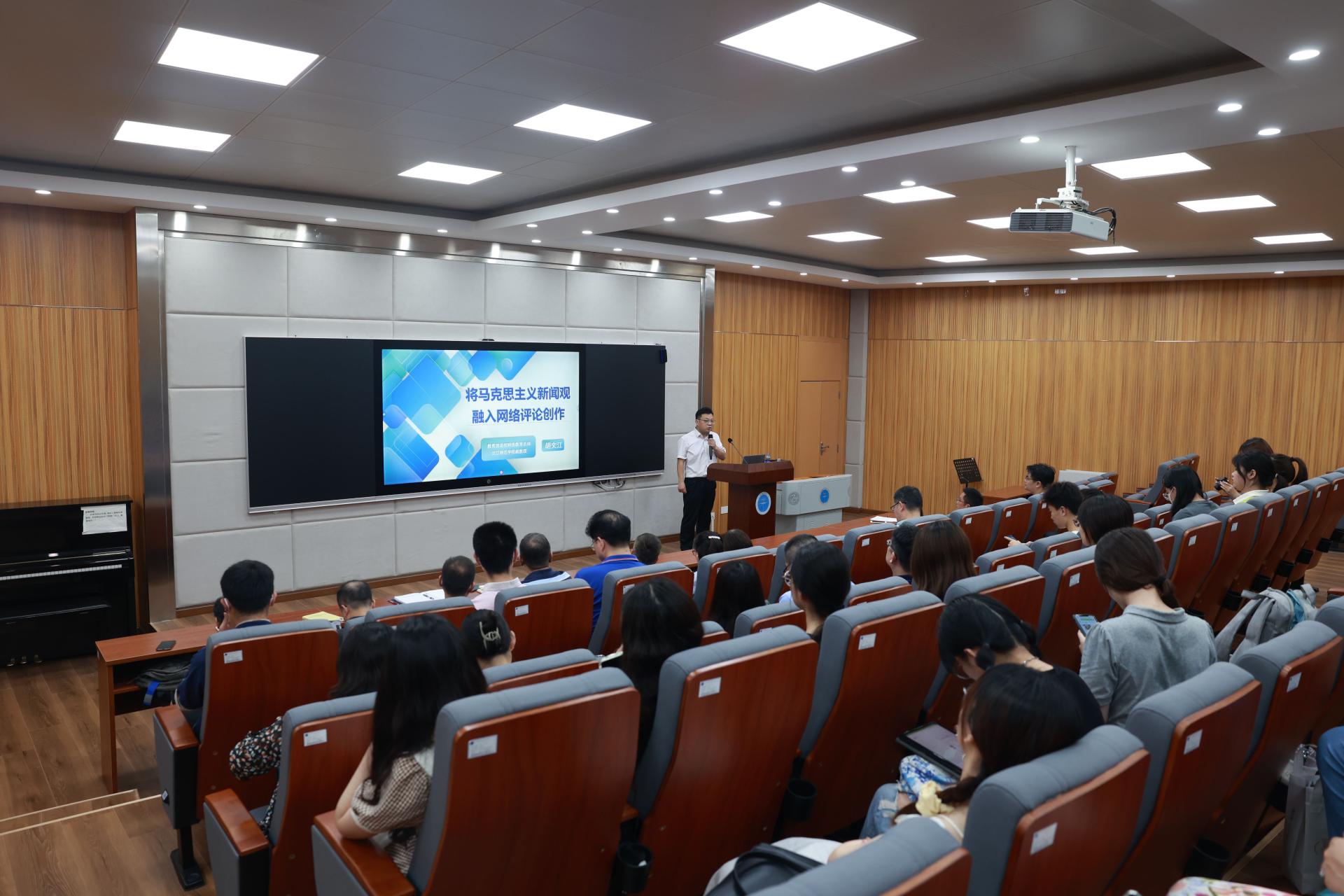 胡文江以《把马克思主义新闻观融入网络评论创作》为题,从“中央高度重视网络思政工作”“发挥好网络评论的育人功能”“将马克思主义新闻观融入网评创作”三个方面,分析了网络评论的概念与特点,从特征、作用、地位、作者四个方面探讨了网络评论的重要性。他认为,网络评论创作中要大力弘扬社会主义核心价值观,高校教职工要积极示范,建强网络评论的师生队伍。