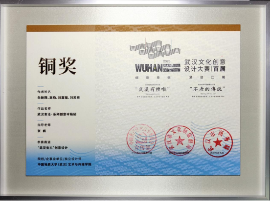 张帆副教授指导的2个研究生团队凭借独特的创意思路、精湛的设计手法以及出色的团队合作精神取得优异成绩。其中朱新翔、高昀、刘嘉瑞、刘苏皖完成的作品“武汉食话·系列创意冰箱贴”获得铜奖;江楠、杨倩瑜、苏恺琳、周缘完成的作品“四季美茶饮产品包装与衍生伴手礼设计”获得创意优秀奖。