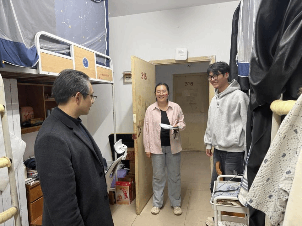 最后一项,在音乐厅结束大一年级集中的线下晚点名后,晚上8点,院领导及全体专兼职辅导员通过实地走访宿舍的方式对其它年级进行周日晚点名。。冷书记与大四年级及研究生同学亲切沟通,对同学们的成长进步予以肯定和鼓励,对同学们提出的问题进行答疑解惑。在关心生活的同时,冷书记认真检查了宿舍的用电设备、门窗床铺等设施,对宿舍卫生及宿舍和谐氛围予以了高度肯定,并叮嘱同学们要健康生活,乐于学习,在学习和生活中遇到问题要及时与辅导员和老师沟通。