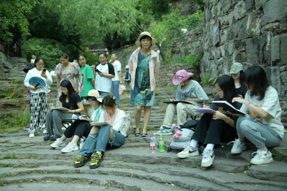 设计学2022级47名同学在周子钦老师、池漪老师和郑丹丹老师的带领下从武汉出发,奔赴河南太行山大峡谷开展为期12天的采风写生实习。