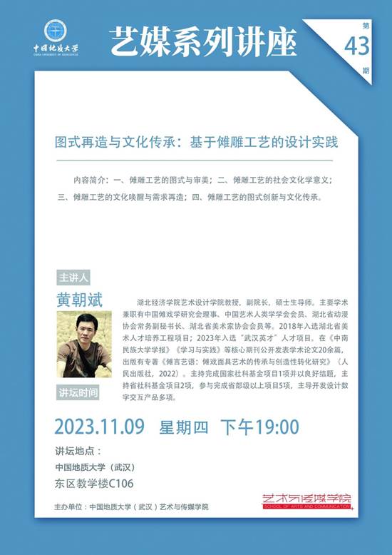 2023年11月9日下午19:00,以图式再造与文化传承:基于傩雕工艺的设计实践为主题的艺术与传媒系列讲座在东教C106顺利召开。此次讲座由蜜桃网