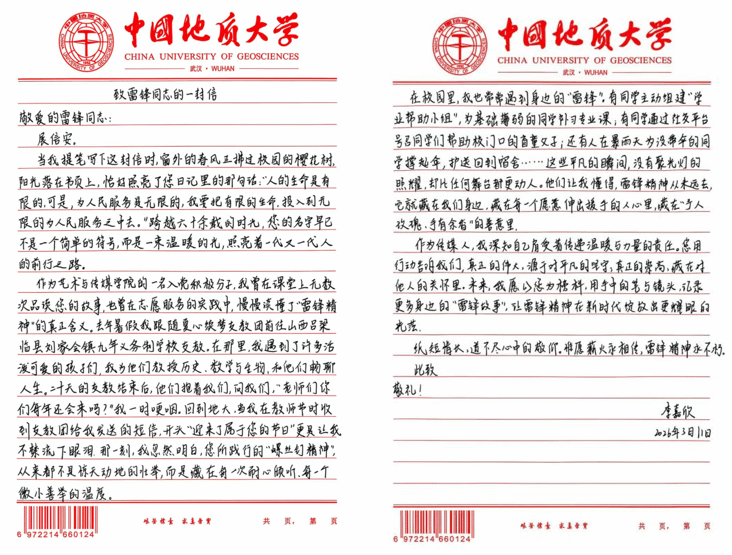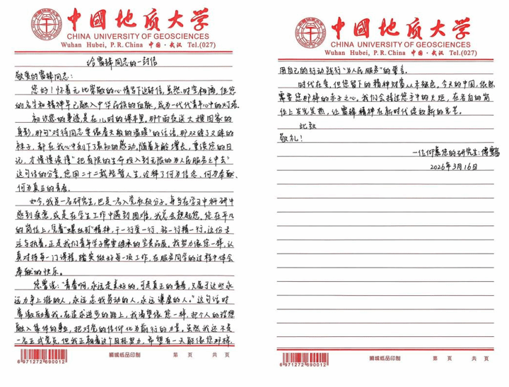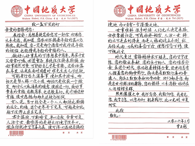 组织学生以手写信形式向雷锋同志表达敬意和感悟,通过文字抒发理想信念和精神追求。信件内容真实质朴、情感真挚,充分体现了青年学生对榜样力量的认同与传承。共征集作品32份,并在地大艺媒党员之家平台集中展示。
