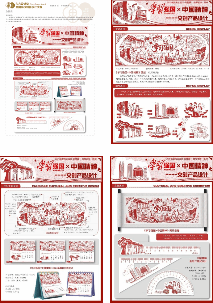 本剪纸以“学习强国×中国精神”为主题,旨在通过传统剪纸艺术形式,将中国共产党精神谱系与艺术传统相结合,通过选取过去、现在、未来三个时间点的精神故事,绘制中国共产党奋斗史。作为主题插画设计,设计旨在表达学习强国与中国精神的紧密联系,展现中华民族的文化自信和精神风貌。