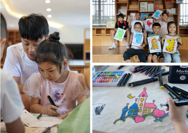 志愿者俯身指导小朋友画画的场景,孩子专注执笔,以孩子视角拍摄绘画作品:志愿者陪小朋友画爱心城堡,桌上摆满彩笔,以童趣笔触定格志愿陪伴瞬间,用彩笔绘就爱心城堡,让雷锋精神在温暖陪伴中生根发芽,诠释新时代志愿服务的暖心内涵。