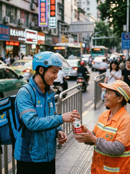 “武汉前几天变天了,中午气候炎热,早上又比较冷,在公交车站等车的时候,我看到一个环卫阿姨弯着腰辛苦地把刚刚被丢掉的烟头扫进簸箕,汗水从她的帽子里流出来。这时,有一个外卖小哥从便利店里出来,手上刚好拿着一瓶矿泉水,看到阿姨的情况,他顾不上自己的口渴,把水递给了她。这珍贵的一幕被我记录了下来,人与人之间的关怀在手掌心之间传递,简单而温暖。”