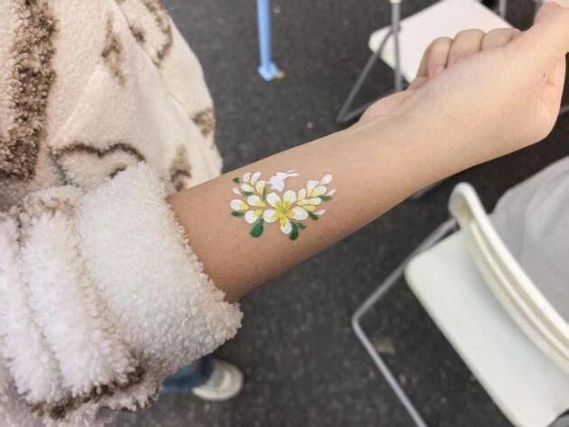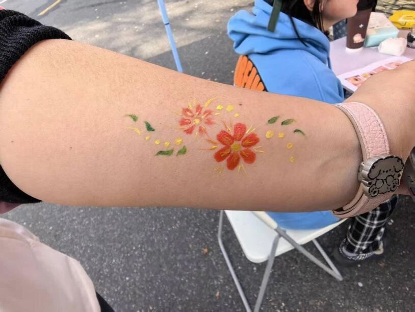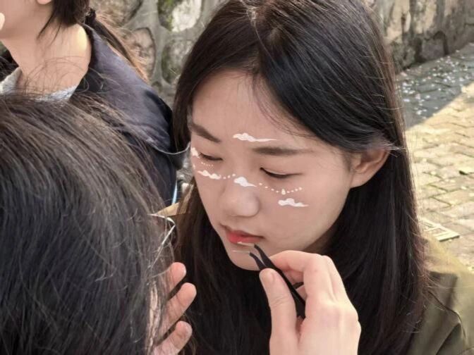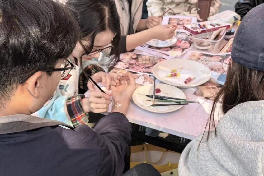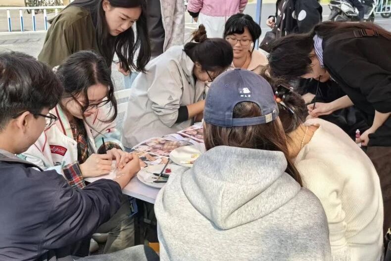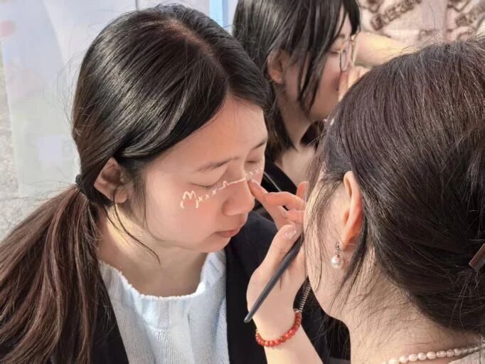 活动依托校园户外开放空间,将春日氛围与创意艺术相结合,把北区隧道口变成一处轻松自在的心灵疗愈场。同学们以面部为独特画布,自由选择色彩与图案,用明快笔触勾勒心中意象:有的以暖黄绘就向阳而生的花朵,传递乐观与希望;有的用冷色调线条勾勒抽象纹理,诉说内心思绪。在涂抹、勾勒、创作的过程中,情绪得以自然流露,压力在轻松的氛围中慢慢释放,现场处处洋溢着温暖与愉悦。