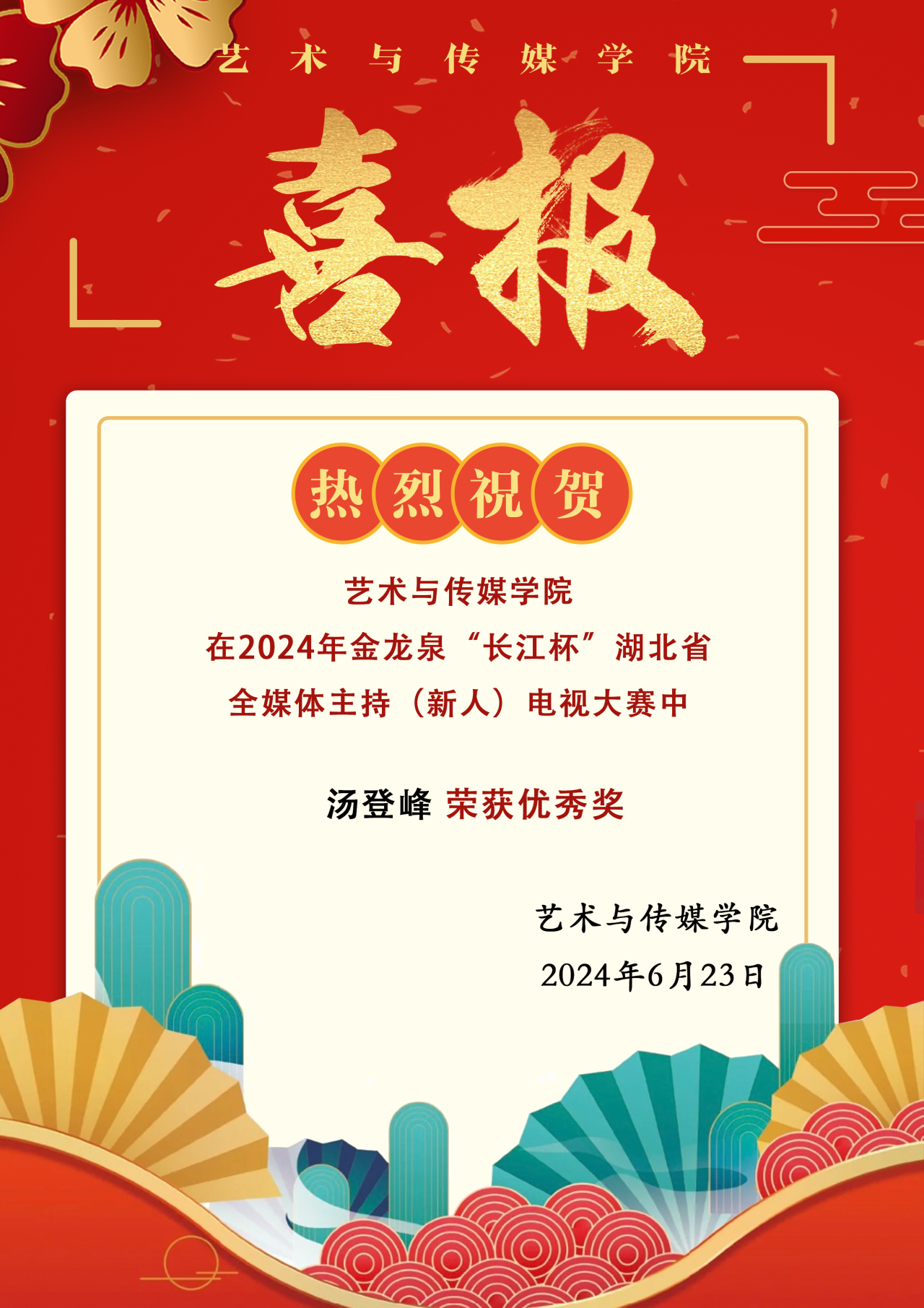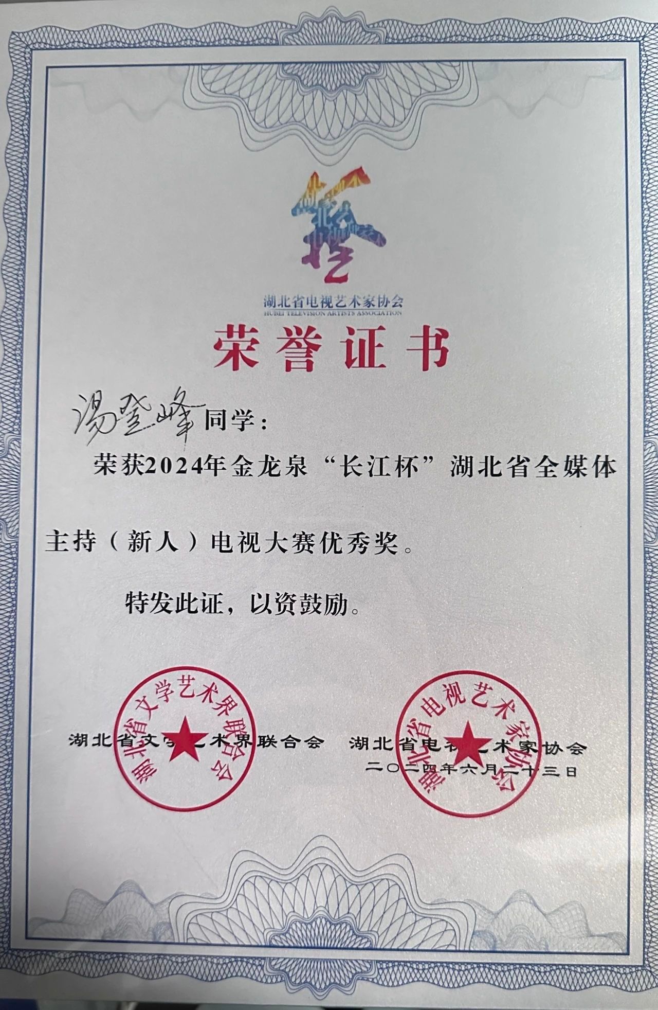 喜报!蜜桃网 汤登峰同学在2024年金龙泉“长江杯”湖北省全媒体主持(新人)电视大赛中荣获优秀奖!