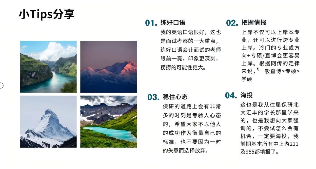首先,广播电视学专业的冷清秋同学从保研材料准备、夏令营和预推免的参加、面试经验等方面为同学们展开分享,详细介绍保研材料如何准备,着重分享了学校选择和英语面试小技巧。