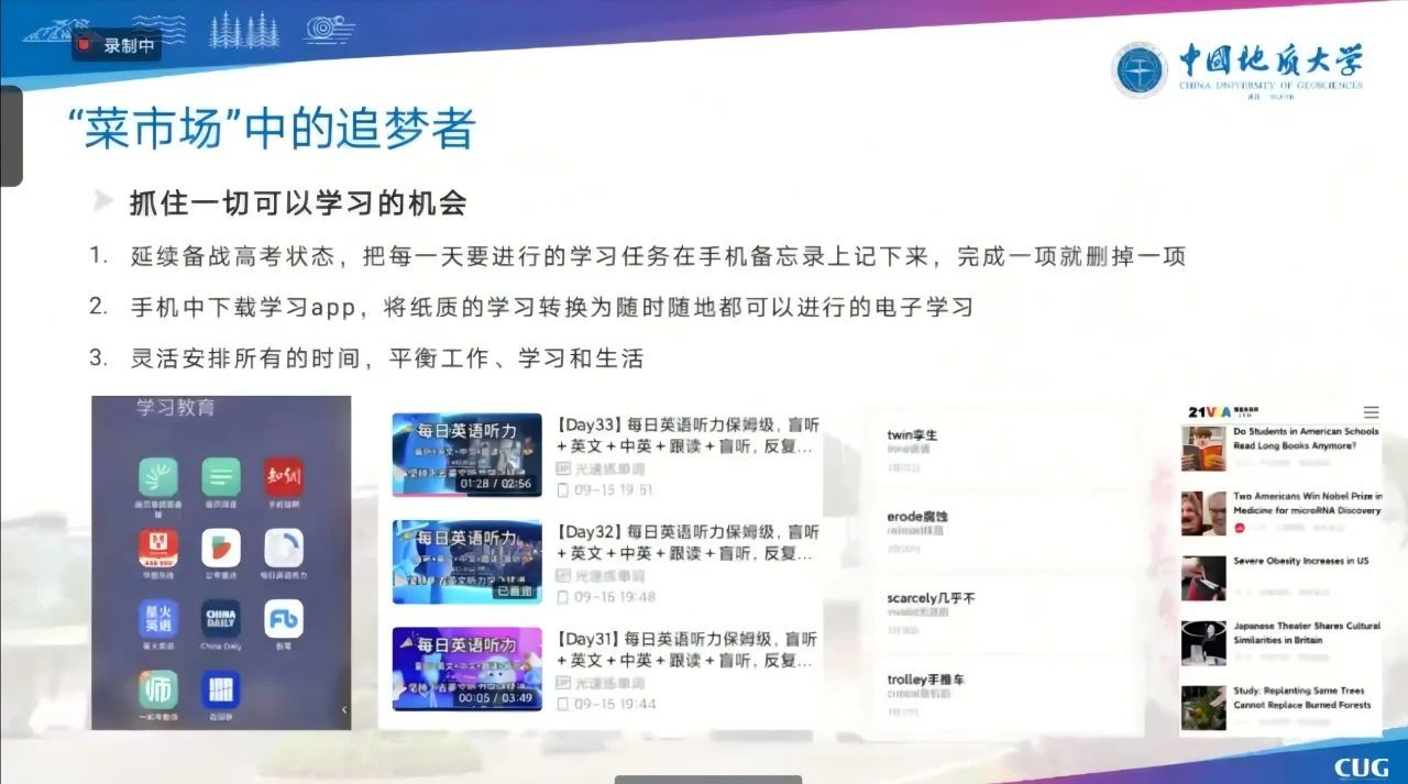 然后,音乐学专业的邹桂珍同学从学习经验、志愿选择和心态调整三个方面展开分享,并结合自身经历告诉同学们在日常学习中要抓住一切可以学习的机会,尽早确认研究生阶段的研究方向。并且要放平心态,对自己要充满信心。