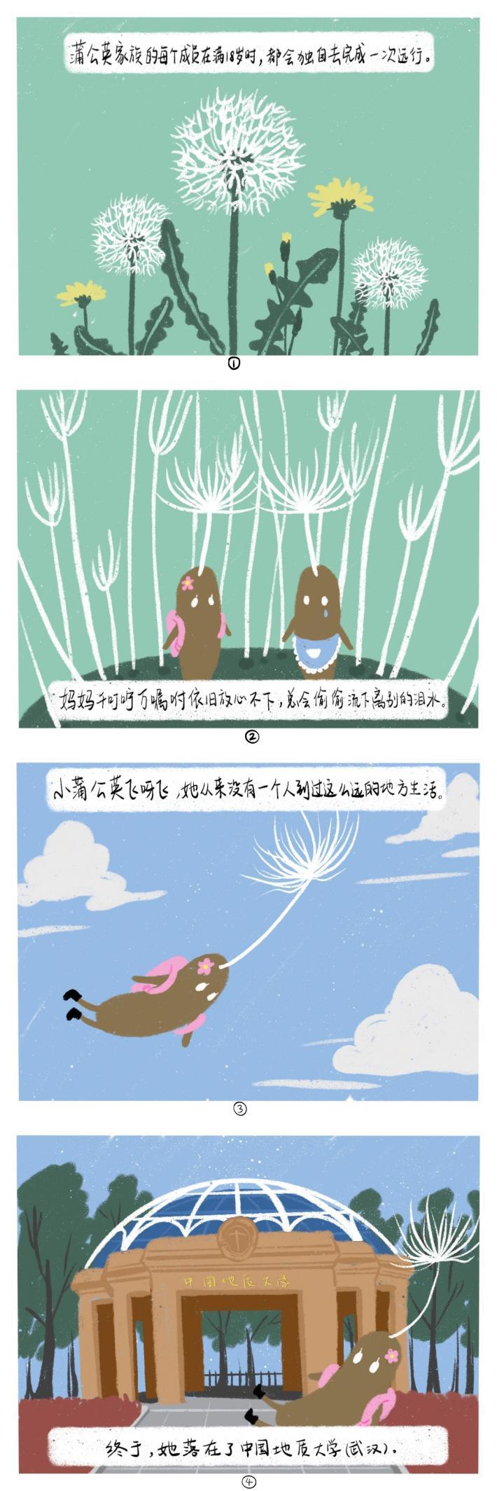 漫画中小小的蒲公英种子随着风离开了家,正如同作者离开家人的庇护,独自来到学校。在这个全新的领域里,当然免不了迷茫和害怕,但是最终这颗种子在这里扎根安家,作者也安定下来,享受着平凡而自在的生活。渺小而平凡的我们也要像这颗小小的种子一般,积极应对改变,要相信,一切都会好起来的!