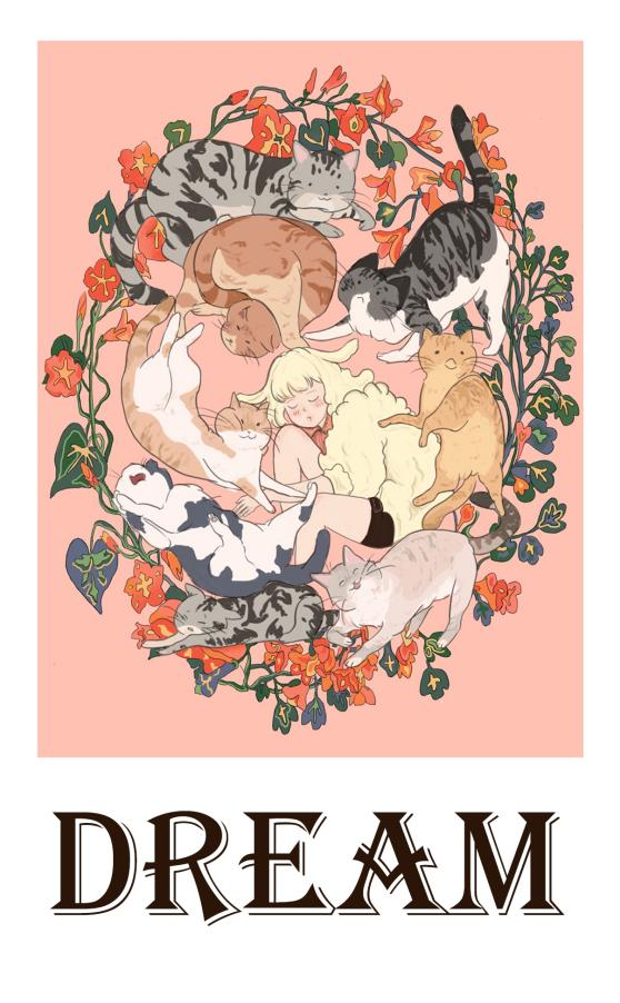 作品以明信片的方式来表现,在春天里做场被小猫咪包围着的梦,梦里阳光灿烂,绿草如茵。这是多么美好,多么幸福的时光!丰沛的情感从作者的笔端自然流露,感染着看到这幅画的每一个人。