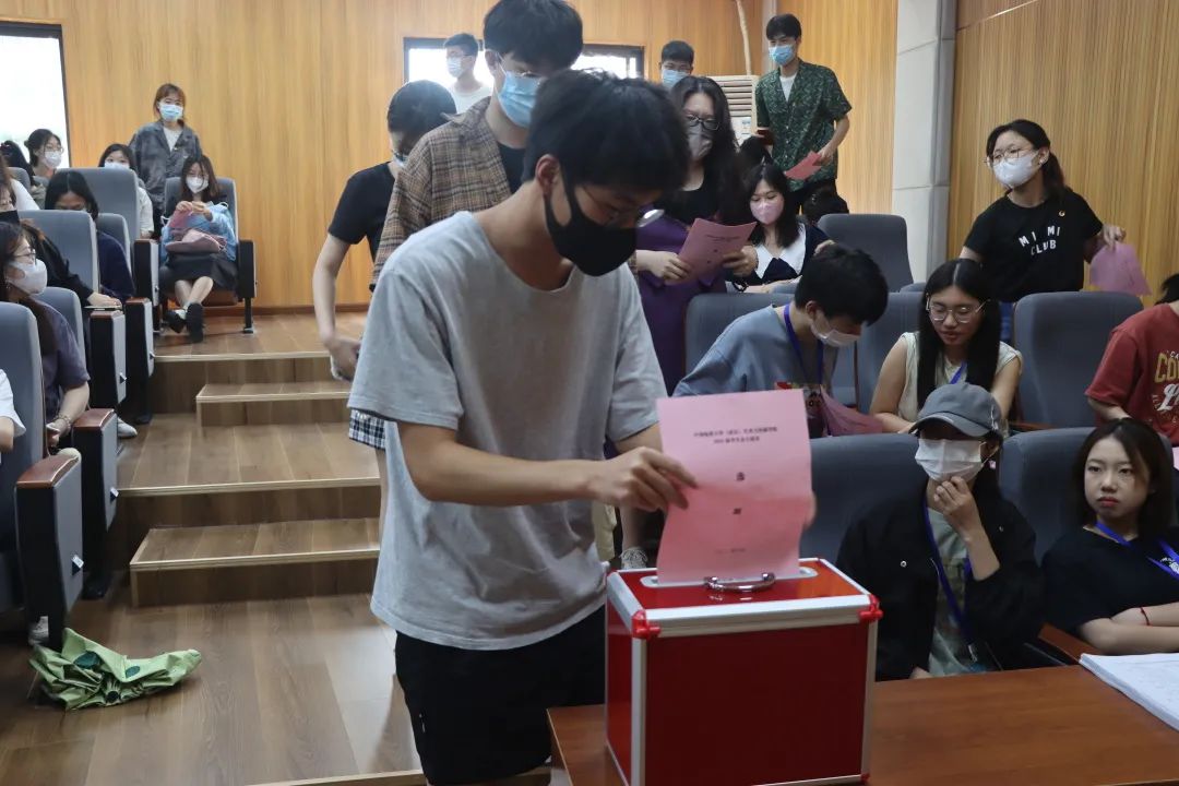 答辩过后,大会正式选举。由工作人员分发选票,并由每位学生代表至多为三名候选人投票,表示弃权则不参与投票,由此选举产生2022届学生会正式候选人。