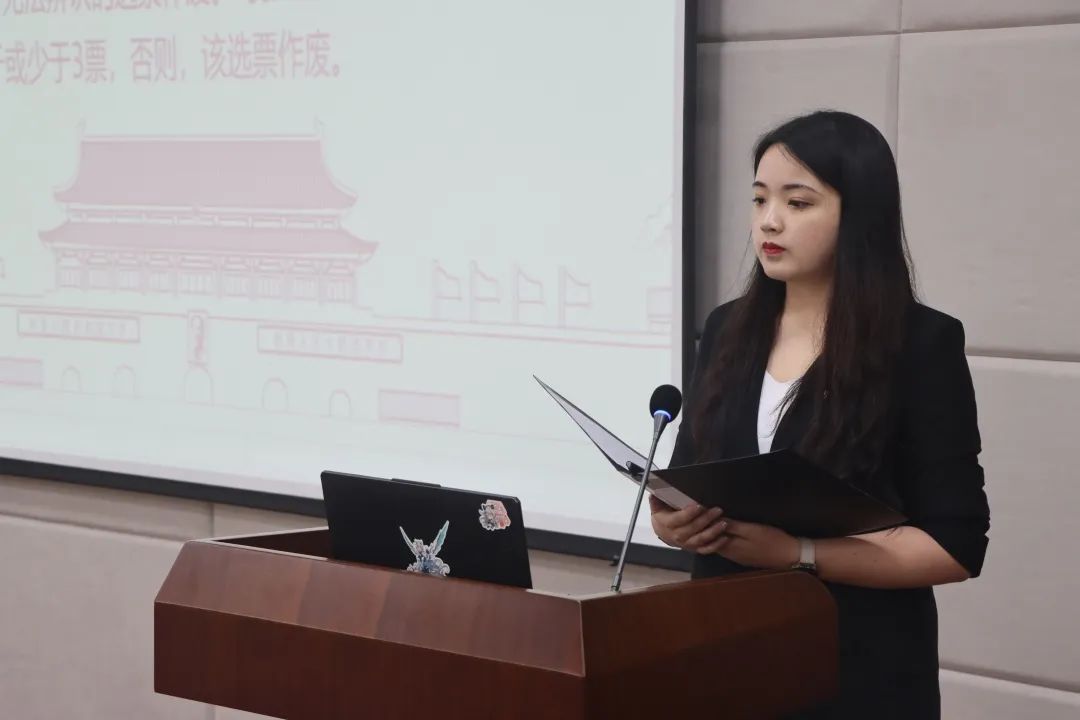 大会第七项,由主持人保悦宣读学代会总监票人、监票人、总计票人、计票人名单。本次大会的总监票人为赵书楠,监票人为黄益明、蒋雨晴、刘睿桢、许佳明。总计票人为易四维,计票人为曹欣、罗熙、胡心瑶、刘畅。参会人员通过举手表决通过此名单。