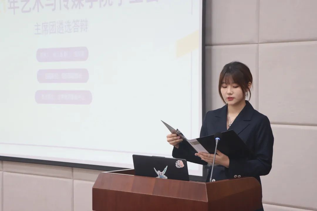 最后,由来自视觉传达专业的3号候选人杨贝涵同学发言。在发言中,她为我们具体提出了完善学生会制度、加强交流、协商合作、共创文化环境等关于未来工作的构想。在发言过后,学生代表和评委分别对其关于如何提高团支书积极性、如何运用好学院官微新媒体平台宣传学院形象、“弘艺班”未来准备开展哪些内容、如何提高青年大学习的完成比例以及如何加强校院班联动的想法进行了提问。