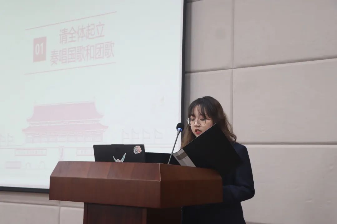 大会第一项,由全体参会人员共同奏唱国歌、团歌,近百名师生全体起立合唱,场面振奋人心。