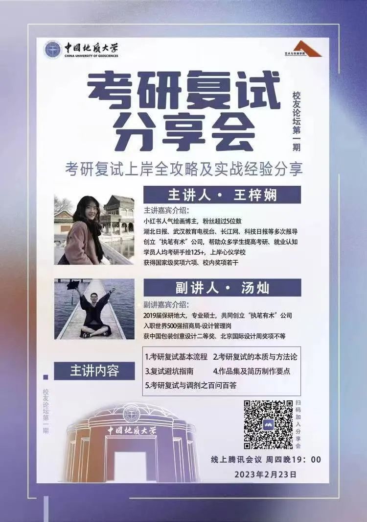在腾讯会议召开了本学期第一期“艺 堂”考研复试专场讲座。“执笔有术”公司的创始人、小红书人气博主王梓娴老师和地大2019级学长汤灿老师做了主题为“2023届考研复试经验解析”的讲座分享。
