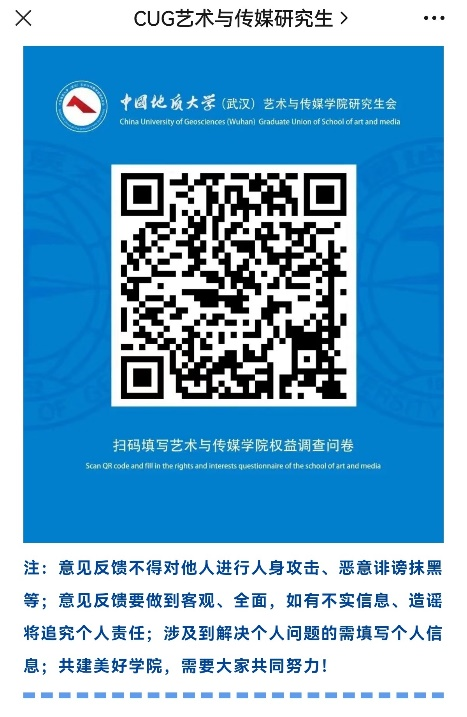 “CUG艺术与传媒研究生”公众号,进入公众号后台并点击右下方“学院工作”中的“反馈系统”,下滑至最底端可以扫码填写艺术与传媒权益调查问卷。