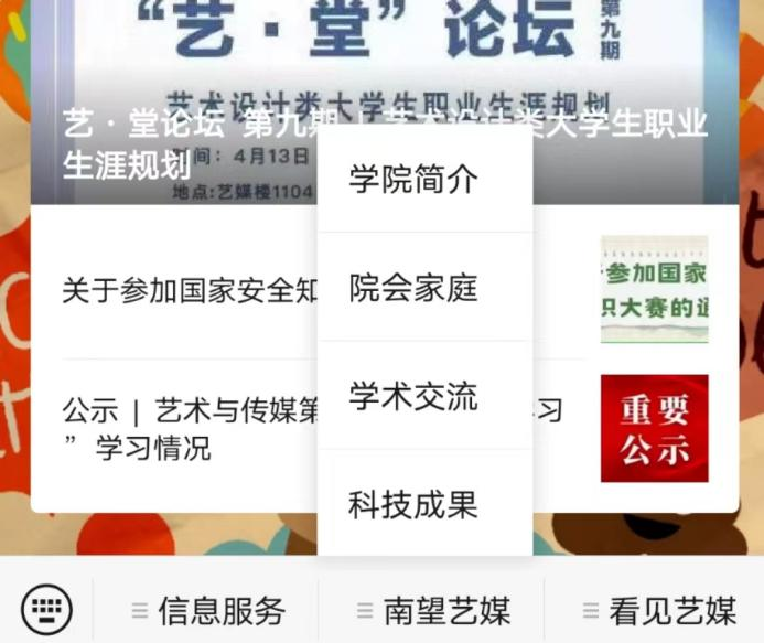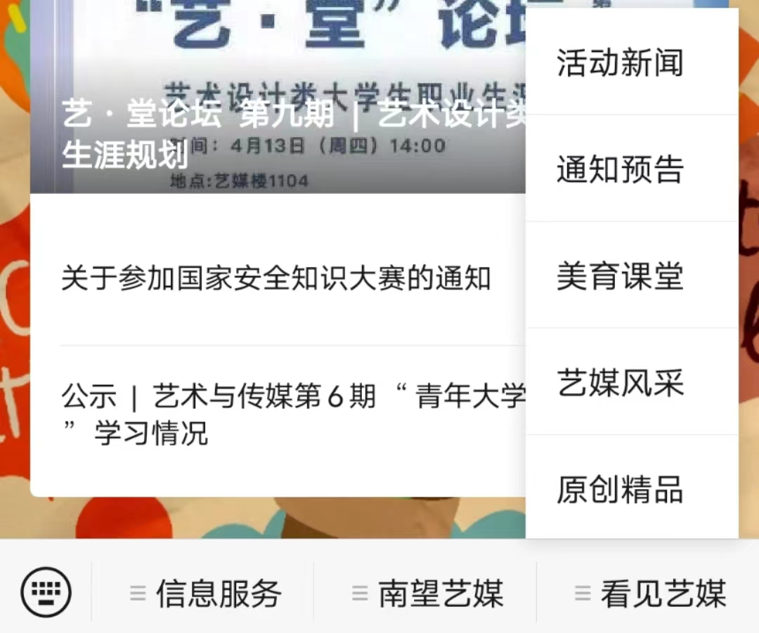 微信公众号“CUG艺媒人”菜单栏经重新设计改版后,现设有3大栏目,分别是信息服务(迎新地图、就业信息)、南望艺媒(蜜桃网简介
