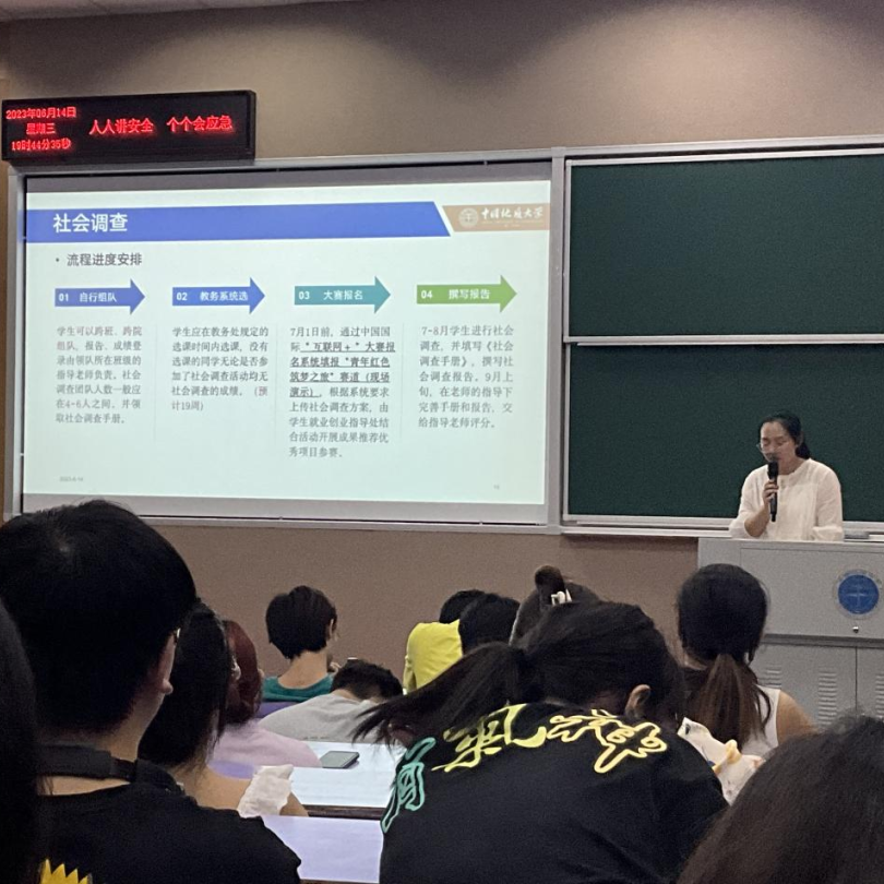 第三部分,曾老师向大家详细讲解了暑期需要进行的社会调查,逐步教学网上操作流程,强调了重要性和截止时间,解答了大家普遍关心的问题等。