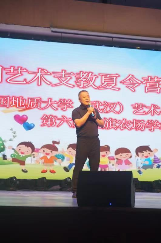 党委副书记边建华上台致辞,边书记首先代表九里阳光艺术支教团对红旗农场的领导、红旗农场学校的领导和老师们对此次支教活动的信任和大力支持表达了最衷心的感谢。他表示自己在这里深深地感受到了红旗农场的小朋友们对艺术的热爱与天赋,相信此次支教活动将作为彼此合作的起点,丰富当地美育实践育人成果,贯彻落实新时代党的治疆方略,切实发挥高校“文化润疆”作用。最后,边书记预祝此次汇报演出取得圆满成功。
