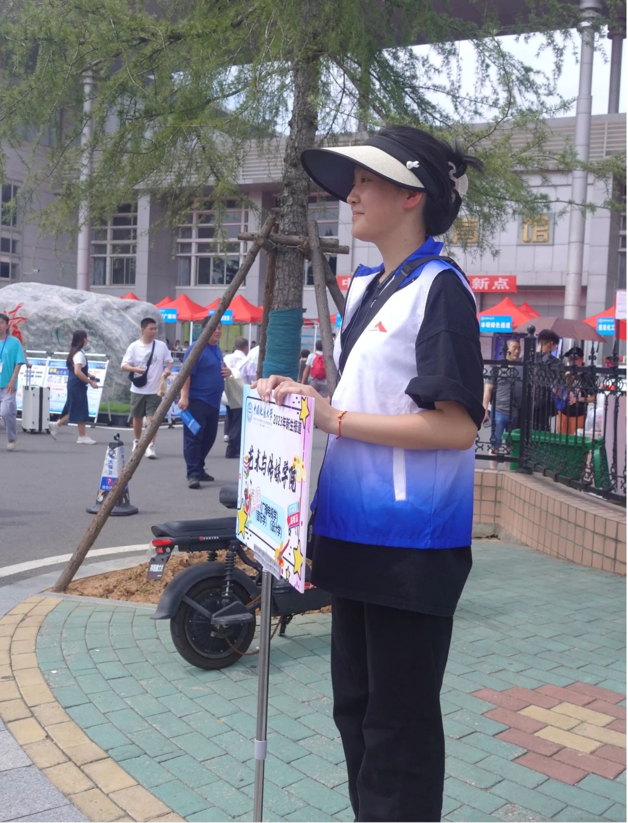 在西区体育馆门前,志愿者们举着“蜜桃网