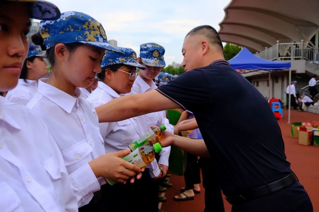 晋书记代表学院为同学们送上学院为大家准备的饮料。天气炎热,希望能为同学们带来一点清凉。晋书记聊起自己当年的军训时光,军训虽苦,但却是同学们迈入大学的第一课。他鼓励同学们要迎难而上,希望此次军训能为同学们的大学生活打下良好的基础。希望大家在军事训练中取得自己最得意的成绩!