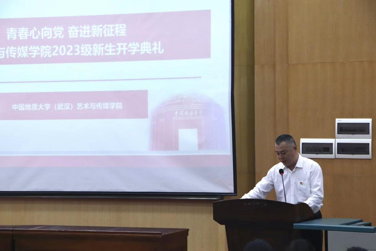典礼第二项,院长何清俊代表学院讲话,何院长首先对2023级新生表达了诚挚的祝贺和热烈的欢迎,介绍了学院的基本情况,并对新生提出了三点希望和建议:一是学会规划时间;二是掌握学习方式;三是加强实践学习。