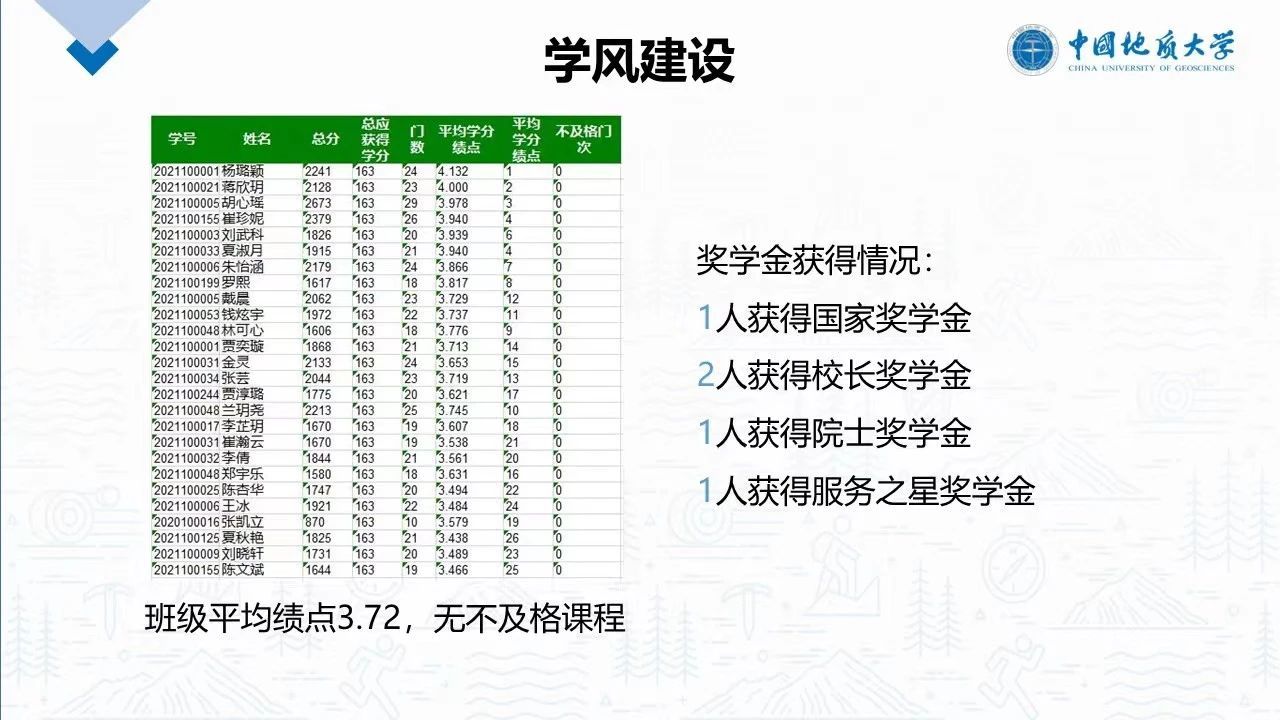 班委深入到同学中去,起带头学习作用,每门课程作业学习委员会提醒大家按时完成,课余时间带领同学去图书馆备考四六级,营造良好的学习氛围。班级成员无挂科,平均学分绩点为3.72,四级通过率为70.6%。