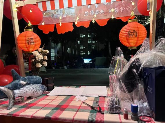 ”几个被红气球簇拥的艺术字体引人注目,两盏红灯笼挂在陈列着鲜花与奖品的桌板上,吸引着同学们的到来。一旁的游戏规则边,驻足着许多跃跃欲试的同学,期待着活动开始。