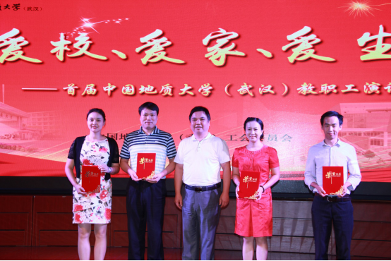 代表队最后一个登场,四位老师集体朗诵了由熊程老师创作的诗歌作品《地大人的歌》,四位老师时而娓娓道来,深情饱满;时而慷慨激昂,激情澎湃,将艺媒学院教职工对地大的爱诠释的淋漓尽致,引得现场评委及观众阵阵掌声。