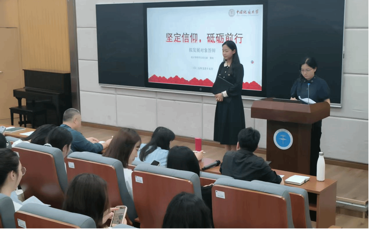 在答辩会上,同学们围绕入党动机、个人情况、考察期间表现、不足之处及未来展望等方面进行展示。设计学专业研究生郭玫同志充分发挥专业特长,展示自己在学校研究生公众号所负责的内容,如参与视频号拍摄、推文系列的组织、采访、协调等工作,体现了将专业知识转化为服务师生、奉献社会的责任担当。