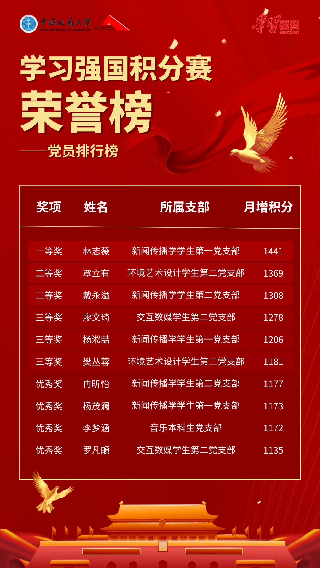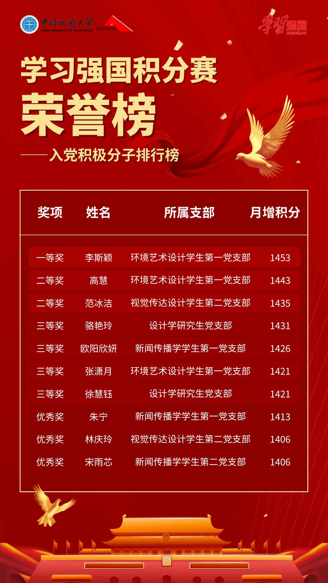 经过28天的激烈角逐,活动评选出10名党员“学习积极之星”、10名入党积极分子“学习积极之星”及3个“学习积极党支部”。个人榜单上,新闻传播学学生第一党支部林志薇以1441分的总积分位列党员排行榜榜首;环境艺术设计学生第一党支部李斯颖以1453分的总积分位列入党积极分子排行榜榜首。支部榜单上,新闻传播学学生第二党支部以724.64的平均周增积分位列第一。